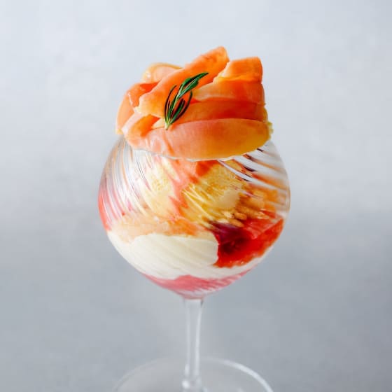 桃の中には、アクセントとなるペリーのコンフィチュールをトップにマスカルポーネクリーム、レモンとライムのクリームを入れています。
