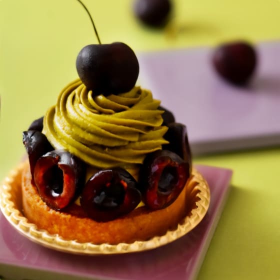 季節限定のアメリカンチェリーをふんだんに飾ったタルトにピスタチオのクリームを合わせたリッチなタルトに仕上げております。